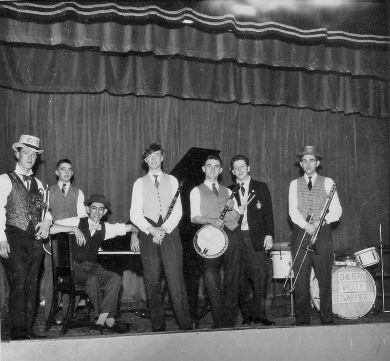 I am trying to locate an ex 87th member, 683581 A/A Martin, block 6 room 2, 2(A) Wing. Bas ) as I new him playing trumpet in a jazz band on camp called The Chiltern Valley Feetwarmers, in which I and three other 84th guys also played. The attached photo show him and some of the other members in the camp theatre. He by the way is on the extreme left.